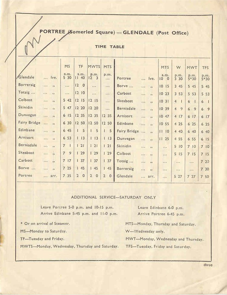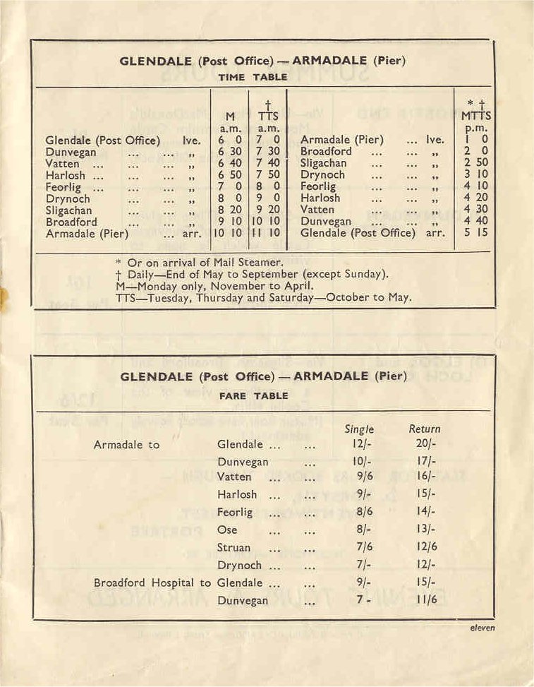 or whether the bus ran through. Armadale was a significant destination for Skye people with it s ferry connection to the railhead at Mallaig and thence trains to Fort William and Glasgow. |