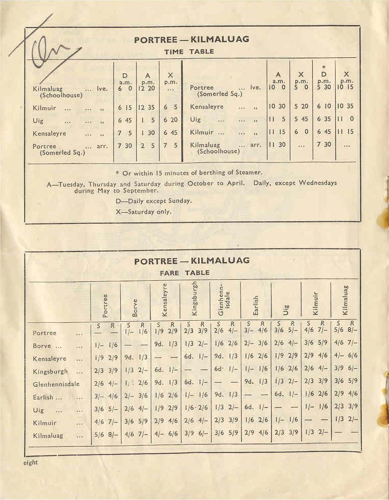 The timetable booklet was current in the early 1950s until the run down and transfer of the Beaton bus routes to other operators on the island. The last route run by Beaton's was to Armadale on 31st August 1953, ending twenty eight years of public bus services by the firm as operation passed to David Macbrayne. The handwritten annotations are believed to refer to the transfer and acquisition of the various routes by their subsequent operators. By scrolling down through this webpage illustrations of all twelve pages of the timetable booklet will be found, covering the times and fares for all of the Beaton routes. The bus illustrated on the front cover is CST92, an Austin K2 14-seater with Walker body, purchased new in 1947 along with sister bus CST301; just two of several such Austins acquired in post war years.