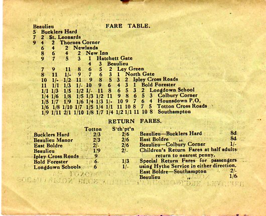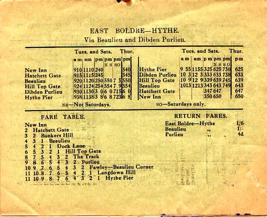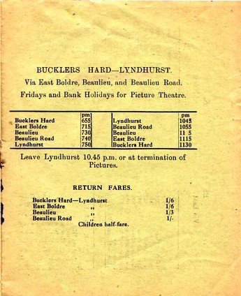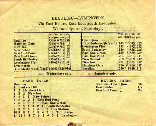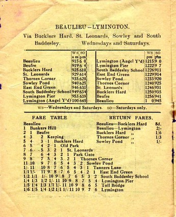 In the timetable above the SO Saturday Only departure from Lymington should read 645 pm and not 745 pm as shown. On arrival at Beaulieu at 705 pm the bus worked through to Hythe Pier and return before forming the 750pm Beaulieu to Lymington. |