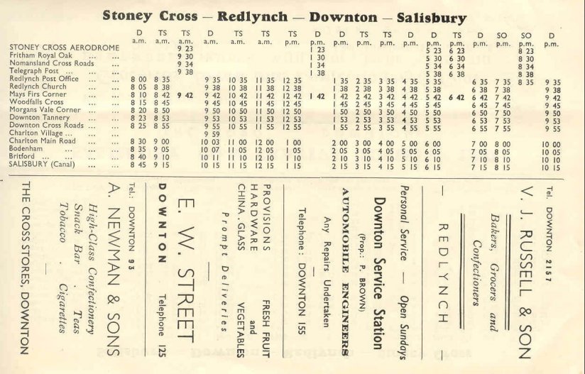 This is the first page of timetables, and contains the weekday timings for the Skylark Motor Services route from Redlynch, Woodfalls and Downton. The Shergold family had been carriers in Woodfalls since before the Great War. A motor bus service was introduced by 1926. Wartime saw the extension of the service across the New Forest to Stoney Down.