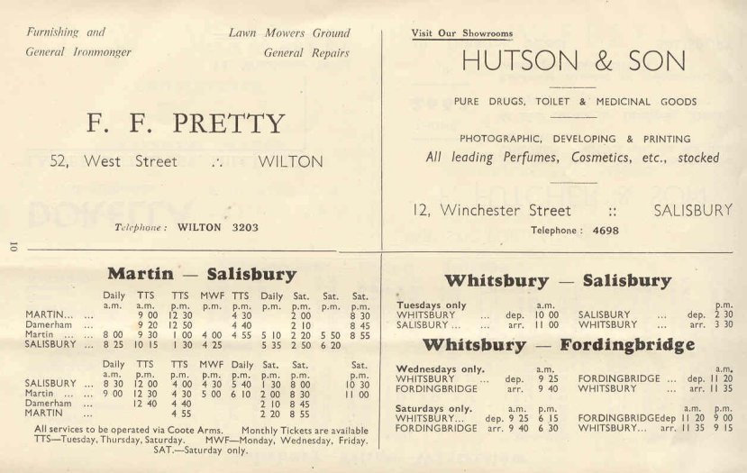 This is the tenth page of timetables, and shows the services of two smaller operators coming into Salisbury from the south. They are Martin Motor Services (M Flemington) and Whitsbury Motor Service (Coombs). Charles Flemington was in business as a haulier in Martin by 1912. The motor bus service had started by 1923 and was extended to Damerham in 1939. The service passed from the Flemington family to Coombe Hill Coaches (R J Chalk Ltd) of Coombe Bissett in April 1974 and subsequently to Wilts & Dorset. The Whitsbury service had been started by Douglas Jerrard of that village in horse drawn days. A motor bus arrived in the 1920s. The routes passed to Mrs D Coombs in 1947 and subsequently to Albert Herrington on 1st July 1953. Herringtons Coaches still run this route on Tuesdays, now extended back to start from Parsonage Park near Fordingbridge, and their operating base is now at Alderholt rather than Whitsbury.