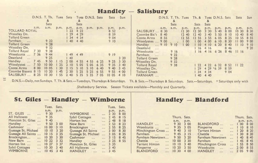 This is the eleventh page of timetables, and is the first of two pages showing the services of Victory Tours of Sixpenny Handley (Adams Bros). There is a mistake in the timetable at the bottom left of the page (St Giles - Handley - Wimborne). The final arrival point on the return journey should read St Giles and not Handley as printed. The Salisbury service started in 1921.