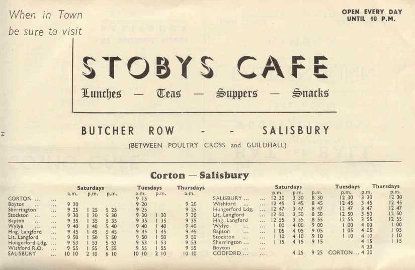 This is the fourteenth page of timetables, and shows the services of H I Couchman of Codford (Wylye Valley Coaches) into Salisbury from the west, along the "back road" on the opposite side of the valley to the A36 main road. Unusually this particular operator is not included in the list of companies on the inside rear cover of the booklet. The route started on 1st March 1912 and changed hands several times in the 1960s before being taken over by Beeline Coaches of Warminster, who still continue to operate it with a single return trip on three days a week (as at September 2004).