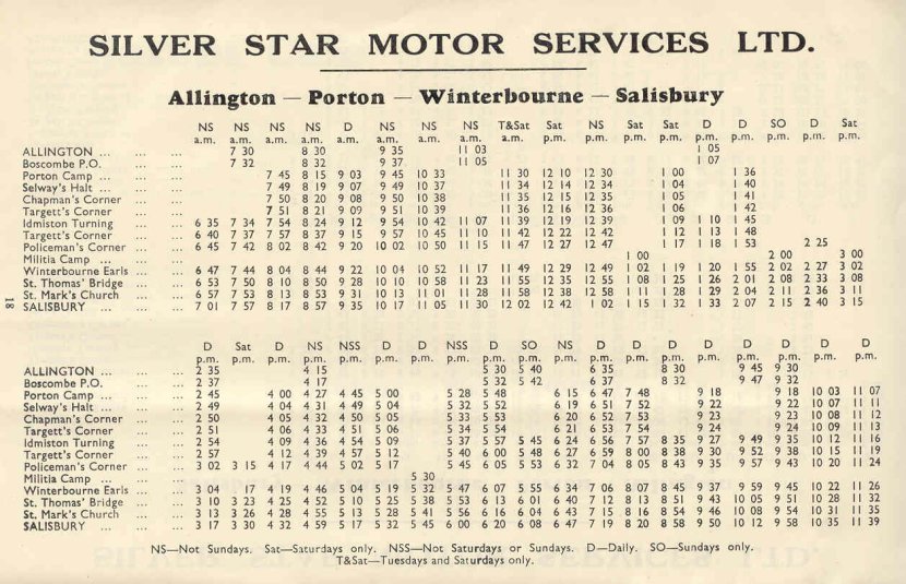 This is the eighteenth page of timetables, and is the second page showing Silver Star Motor Services. Operating from a base at the military establishment of Porton Down, Silver Star had been founded by Ben Shergold and Eddie White in 1923. The service had grown to become a daily operation by 1927. The firm grew to become a prestigious operator, for long associated also with forces leave express services from the camps on Salisbury Plain. Eddie died in October 1962 and Ben decided to retire in 1963. The services then passed to Wilts & Dorset.