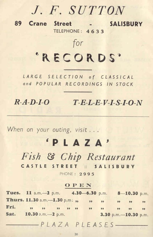 This is the twentieth page of the timetable booklet, and is again a page of advertisements only. Television was very much a luxury and a novelty in those far off days. Suttons are still in business, but now in Endless Street opposite the Wilts & Dorset bus station. But I expect there's still a fish and chip shop in Castle Street!