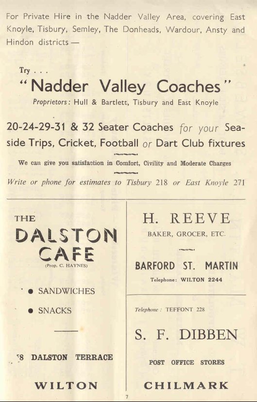 This is the seventh page of the timetable booklet, and contains an advertisement for Nadder Valley Coaches of Tisbury and East Knoyle. Nadder Valley had been formed by the amalgamation of two earlier businesses, C W Hull of Tisbury and R G Bartlett of East Knoyle. The partnership of Hull & Bartlett was formed in 1947.