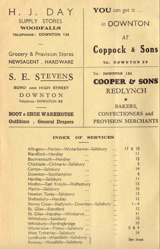 This is the inside front cover which includes an index giving a list of all of the various services and timetables included in the booklet. Some services are not included in this list, eg (i) W Otton & Son of Cranborne, Dorset, who came from that village on Tuesday market day until late 1952; (ii) A H Razey of Thruxton who came from Grately, Quarley and Cholderton until autumn 1959; (iii) Moore Bros of Lockerley, who came from there by way of Tytherley, West Dean and West Grimstead until 1st October 1951, when their routes were taken over by Budden of West Tytherley and incorporated into their existing services to Salisbury; (iv) Mrs M Lee of Winterbourne Gunner, who operated from East Gomeldon to Salisbury, and was taken over by Silver Star during 1949. One can but wonder why they were not included in this book!
