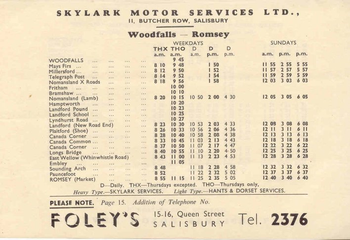 This is the second part of the inset referred to on the inside front cover of the timetable booklet, and gives details of the Skylark service between Romsey and Woodfalls, including some Hants & Dorset Motor Services timings between Nomansland and Romsey. The Skylark timings are different on Thursdays, the market day at Romsey.